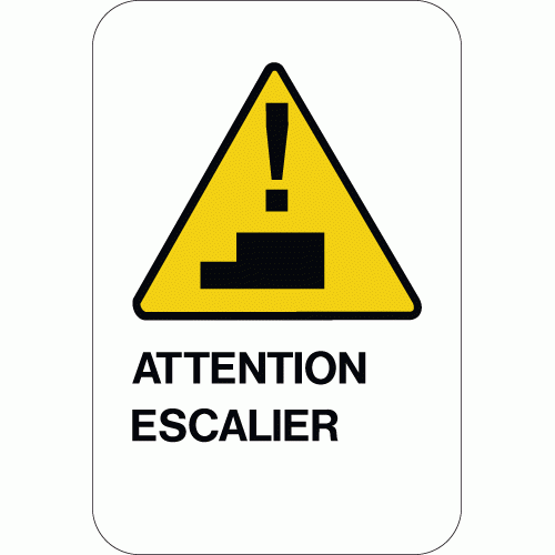 Panneau de signalisation industrielle d’avertissement d’attention, attention escalier,  avec pictogramme standardisé.
