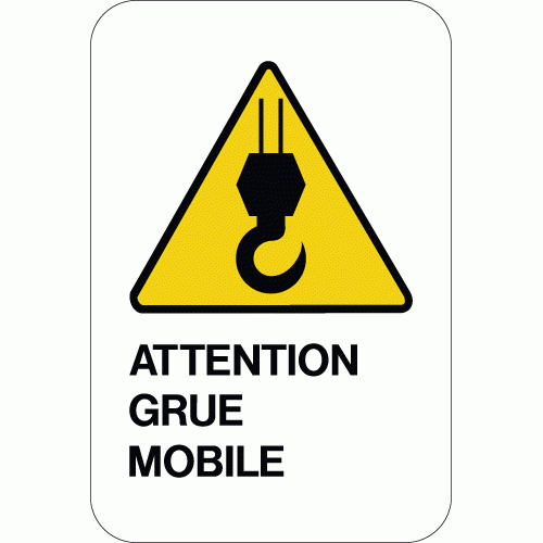 Panneau de signalisation industrielle d’avertissement d’attention, attention grue mobile, avec pictogramme standardisé.