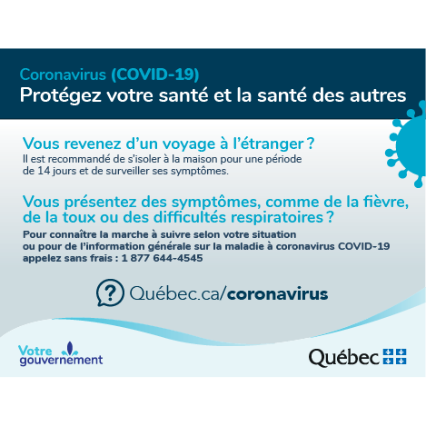 Vous présentez des symptômes, comme de la fièvre, de la toux ou des difficultés respiratoires? Pour connaître la marche à suivre selon votre situation ou pour de l’information générale sur la maladie à coronavirus COVID-19 appelez sans frais : 1 877 644-4545.