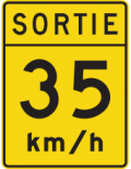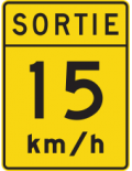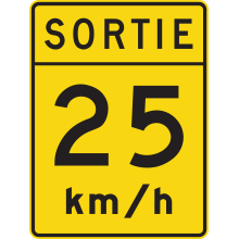 Le panneau « Vitesse recommandée dans une voie de sortie » (D-120) indique la vitesse recommandée dans les voies de sortie d’une autoroute. Ce panneau doit être installé au point de divergence de la voie de sortie.
