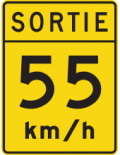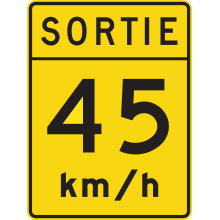 Le panneau « Vitesse recommandée dans une voie de sortie » (D-120) indique la vitesse recommandée dans les voies de sortie d’une autoroute. Ce panneau doit être installé au point de divergence de la voie de sortie.
