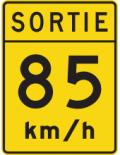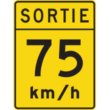 Le panneau « Vitesse recommandée dans une voie de sortie » (D-120) indique la vitesse recommandée dans les voies de sortie d’une autoroute. Ce panneau doit être installé au point de divergence de la voie de sortie.