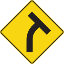 Le panneau « Intersection en T dans une courbe » (D-160) indique l’approche d’une intersection en forme de T, dont la tige est en courbe. Ce panneau doit être installé en amont de la courbe, sur la tige du T, lorsque :