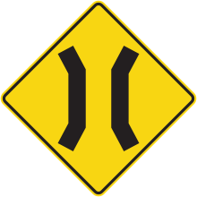 Le panneau «Passage étroit» (D-200) indique que la largeur de la chaussée d’un pont, d’un tunnel ou d’une voie cyclable est moindre qu’à leurs abords. Lorsque la largeur de la chaussée est inférieure à 6 m, le panonceau D-200-P doit est fixé au-dessous du panneau D-200.