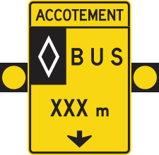 Le panneau « Signal avancé de voie réservée » (D-250-3-A) indique à l’avance une voie réservée à certaines catégories de véhicules. Le panneau D-250-3-A doit être installé au-dessus des voies.