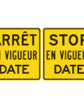 Les panneaux « Nouvelle signalisation » (D-040) indiquent un changement dans la régulation de la circulation à un carrefour. Les panneaux D-040-3 à D-040-5, qui indiquent le nombre de panneaux « Arrêt » installés à l’intersection, doivent être installés pendant un mois à compter de la date du changement effectué dans la régulation de la circulation à un carrefour. Ces panneaux doivent être installés sur toutes les approches du carrefour visé et être accompagnés du panonceau D-040-P-1.