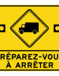 Le panneau « Préparez-vous à arrêter » (D-060-4) indique à l’avance la proximité d’une zone où la circulation est congestionnée. Il peut être installé aux endroits où se créent de longues files d’attente, comme à l’approche des traverses par bateau (À PROXIMITÉ D’UN DÉBARCADÈRE) ou des sorties d’autoroute à (OÙ LE REFOULEMENT EST CYCLIQUE) refoulement cyclique.