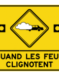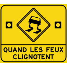 Le panneau « Chaussée glissante » (D-61-4) indique que la chaussée peut être glissante. Il est installé lorsque la chaussée est fréquemment mouillée sur un tronçon de route, la rendant particulièrement glissante par endroits.