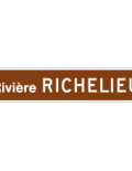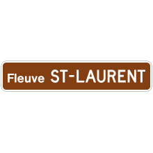 Les panneaux «Élément hydrographique» (I-210) indiquent le nom des lacs, des rivières, du fleuve, des réservoirs et des chutes figurant sur la Carte routière du Québec.