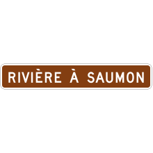 Le panonceau I-210-P, indiquant une rivière à saumon, peut être installé sous le panneau I-210-2 lorsque la pêche au saumon dans la rivière est contrôlée