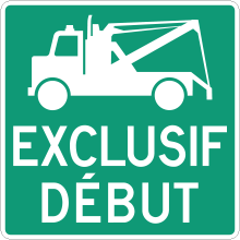 Les panneaux « Remorquage exclusif » (I-419) indiquent que le remorquage sur une section d’un chemin public est réglementé et réservé exclusivement au remorqueur dont le numéro de téléphone figure sur le panonceau I-419-P. Le panneau I-419-1 est installé à l’entrée de la section du chemin où le remorquage est reglementé.