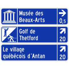 La signalisation des équipements touristiques privés indique la présence d’attraits, d’activités et de services d’hébergement exploités par une entreprise privée ou une société d’État. Le panneau « Acheminement » (I-530-3) guide l’usager de la route jusqu’à l’équipement ainsi que la distance.