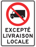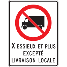 Les panneaux «Accès interdit aux camions» (P-130-1, P-130-15 à P-130-20 et P-130-25 à P-130-27) indiquent un accès interdit aux camionneurs. Les panneaux P-130-15 à P-130-19, P-130-25 et P-130-27 indiquent aux conducteurs qu’il leur est interdit de circuler sur un chemin public lorsque la charge, la longueur, la largeur ou le nombre d’essieux de leur véhicule dépasse les limites maximales de charge, de longueur, de largeur ou de nombre d’essieux autorisées sur ce chemin public. Pour permettre aux camions de circuler sur ces chemins publics afin d’effectuer une livraison locale, les panneaux P-130-15, P-130-16 et P-130-19 sont utilisés.