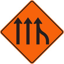 Les panneaux «Fusion de voies» (T-100) indiquent, sur un chemin public comportant plus d’une voie de circulation dans le même sens, qu’une des voies de circulation est temporairement fermée en raison de travaux et qu’il y a lieu d’emprunter celles demeurées ouvertes à la circulation.