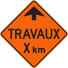 Le panneau «Distance à parcourir avant d’atteindre l’aire de travail» (T-20) indique, à l’avance, à quelle distance de ce panneau se trouve une aire de travail.