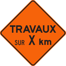 Le panneau «Étendue des travaux» (T-30) indique l’étendue en kilomètres de l’aire de travail. Il doit être utilisé lorsque les travaux de longue durée sont effectués sur une distance supérieure ou égale à 3 km.