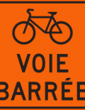 Les panneaux T-80-1 à T-80-11, indiquent que l’endroit visé par le panneau est temporairement fermé à la circulation. Ces panneaux doivent être accompagnés des panneaux « Détour » (T-90).