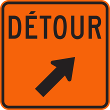 Les panneaux «Détour» indiquent la direction de l’itinéraire de détour prévu que doivent suivre les usagers de la route ou les cyclistes en raison des travaux.