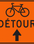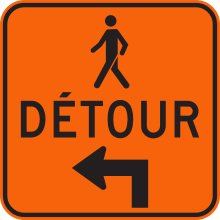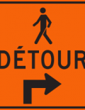 Les panneaux « Détour pour piétons » (T-90-16 à T-90-18) indiquent la direction du chemin de détour à suivre par les piétons en raison de travaux. Ces panneaux doivent être installés aux endroits appropriés pour indiquer le parcours à emprunter par les piétons.
